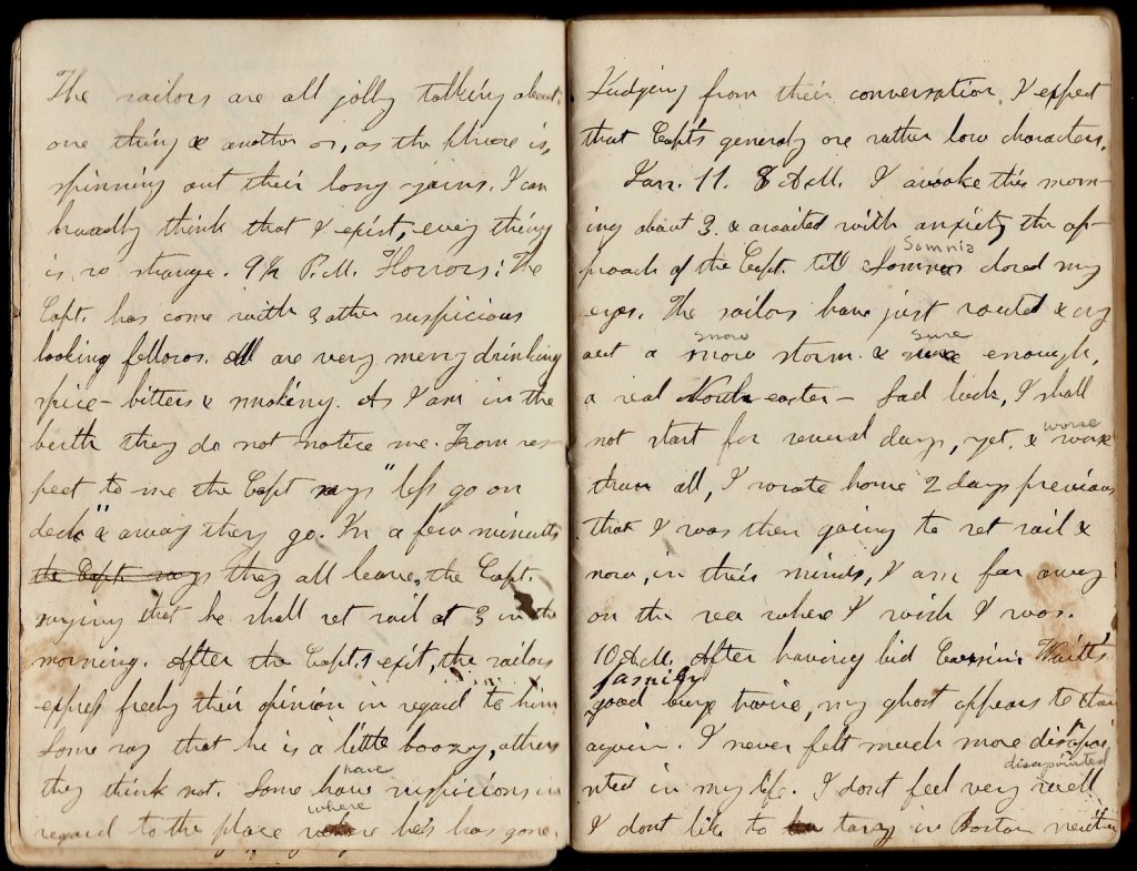 January 10th. 7 p.m. On board schooner in the night. Expect to start at 9. The sailors are all jolly talking about one thing & another or, as the phrase is, “spinning out their long yarns.” I can hardly think that I exist, everything is so strange. 9:30 p.m. Horrors! The captain has come with three other suspicious-looking fellows. All are very merry, drinking spice bitters & smoking. I am in the berth [but] they do not notice me. From respect to me, the captain says, “Let’s go on deck” and away they go. In a few minutes they all leave. The captain saying that he shall set sail at 3 in the morning. After the captain’s exit, the sailors express freely their opinion in regard to him. Some say that he is a little boozy, others they think not. Some have suspicions in regard to the place where he has gone. Judging from their conversation, I expect that captains generally are rather low characters.