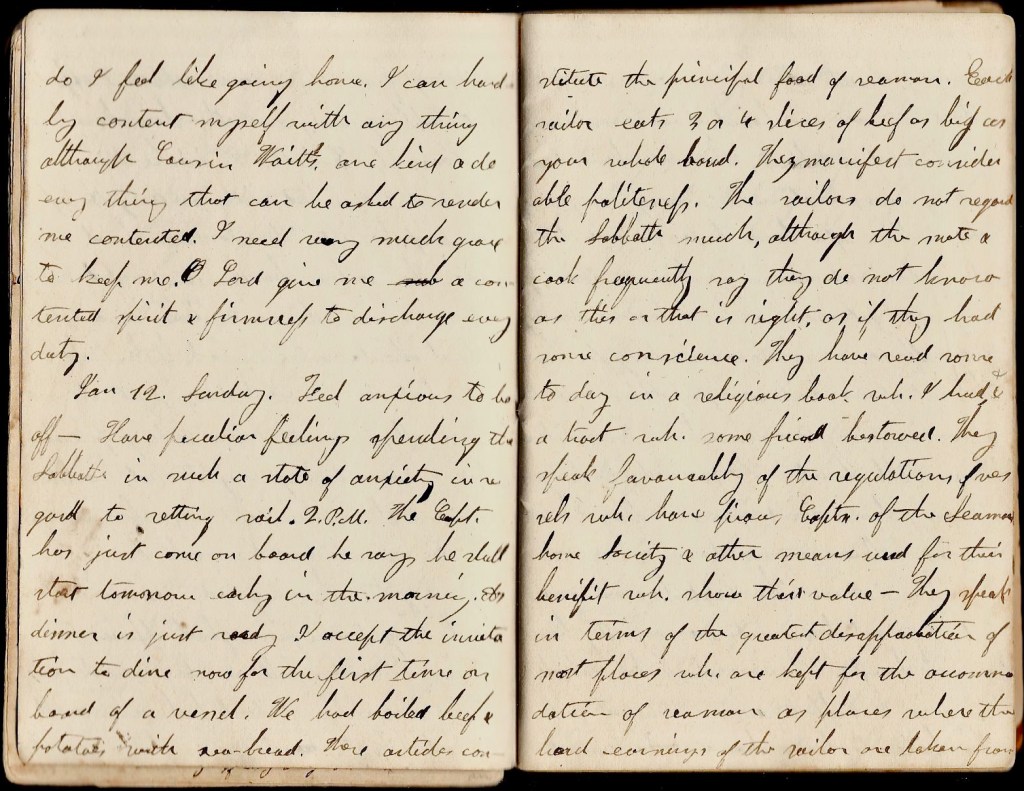 January 12th. Sunday. Feel anxious to be off. Have peculiar feelings spending the Sabbath in such a state of anxiety in regard to setting sail. 2 p.m., the captain has just come on board. He says he shall start tomorrow early in the morning. A dinner is just ready. I accept the invitation to fine now for the first time on board of a vessel. We had boiled beef & potatoes with sea-bread. Those articles constitute the principal food of seamen. Each sailor eats 3 or 4 slices of beef as big as your whole hand. They manifest considerable politeness. The sailors do not regard the Sabbath much, although the mate and cook frequently say they do not know as this or that is right, or if they had some conscience. They have read some today in a religious book which I had & a tract which some friend bestowed. They speak favorably of the regulations of vessels which [ ] captain of the Seaman’s Home Society & other means used for their benefit which show their value. They speak in terms of the greatest misappropriation of most places which are kept for the accommodation of seamen as places where the hard earnings of the sailor are taken from him by fraud. There is one on board of our vessel now—a Spaniard—who has been cheated out of every cent in this way—nay, more as the villain of a housekeeper pretends that the Spaniard is owing him and is trying to get some of his advance money. The officers are now searching for him. The rest of our sailors sympathize with him & are continuing to rescue him. The sailors have noble hearts. They need the prayers of every benevolent person. May I exert a good influence on them.
