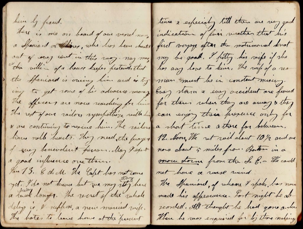 January 11th. 8 a.m. I awoke this morning about 3 and awaited with anxiety the approach of the captain till somnia closed my eyes. The sailors have just routed & say [ ] a snow storm & sure enough, a real Northeaster. Sad luck. I shall not start for several days yet & worse than all, I wrote home 2 days previous that I was then going to set sail & now, in their minds I am far away on the sea where I wish I was. 10 a.m. After having bid cousin’s Waitt’s family goodbye twice, my ghost appears to stay again. I never felt much more disappointed in my life. I don’t feel very well. I don’t like to tarry in Boston. Neither do I feel like going home. I can hardly content myself with anything although Cousin Waitt’s are kind and do everything that can be asked to render me contented. I need very much grace to keep me. O Lord, give me a contented spirit and firmness to discharge every duty.