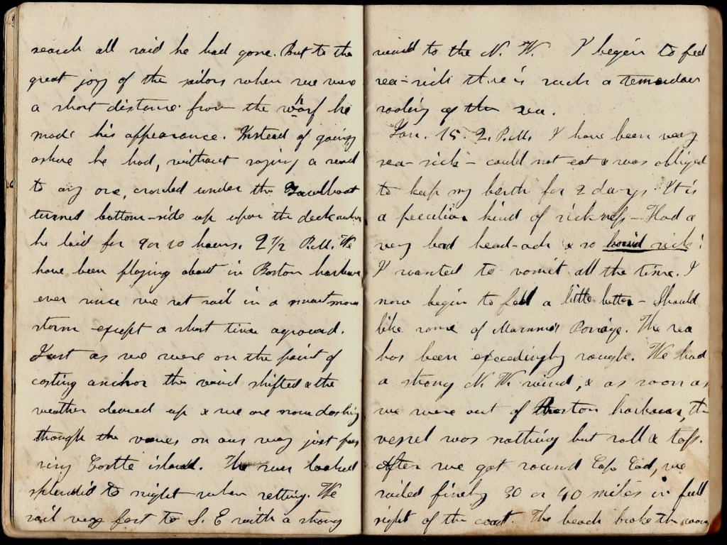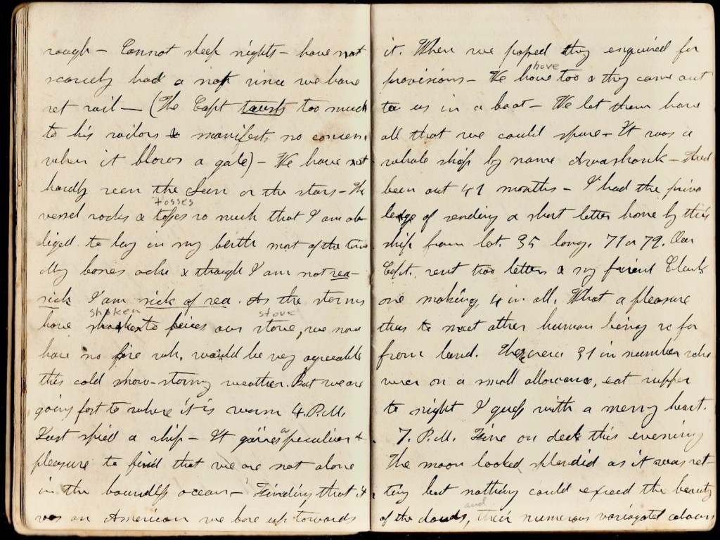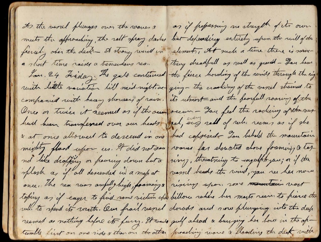 January 15th. 2 p.m. I have been very seasick. Could not eat & was obliged to keep my berth for 2 days. It is a peculiar kind of sickness. Had a very bad headache & so horrid sick I wanted to vomit all the time. I now begin to feel a little better. Should like some of Mamma’s porridge. The sea has been exceedingly rough. We had a strong N W. wind & as soon as we were out of Boston Harbor, the vessel was nothing but roll & toss. After we got around Cape Cod, we sailed 30 or 40 miles in full sight of the coast. The beach broke the [ ] and the strong fair wind set us forward at the rate of 8 or 9 miles to the hour. We passed the cape about 10 p.m. For 30 or 40 miles it is a high, bleak-looking beach. The next day we sailed forward with a strong N. wind but had a rough sea. In the following night we were overtaken by a violent N. E. storm, accompanied with numerous squalls of sleet & snow. In the morn the storm had in a measure ceased but the sea was awfully high. The wind at one time seemed to mount to the skies. At another to plunge into the deep & at the same time such a rolling & pitching as passed all my expectations.