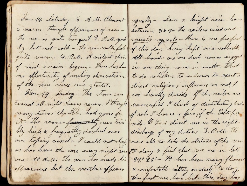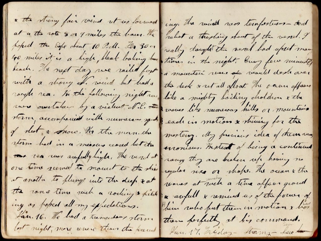 January 16th. We had a tremendous storm last night—more severe than the preceding. The wind was tempestuous and what a thrashing about of the vessel. I really thought the vessel had upset many times in the night. Every few minutes a mountain wave would dash over the deck & set all afloat. The ocean appears like a mighty boiling caldron & the waves like numerous hills or mountains, each in motion & striving for the mastery. My previous idea of them very erroneous. Instead of being a continued range, they are broken up having no regular size or shape. The ocean and the waves at such a time appear grand & awful & remind us of the power of Him who put them in motion & has them perfectly at his command.