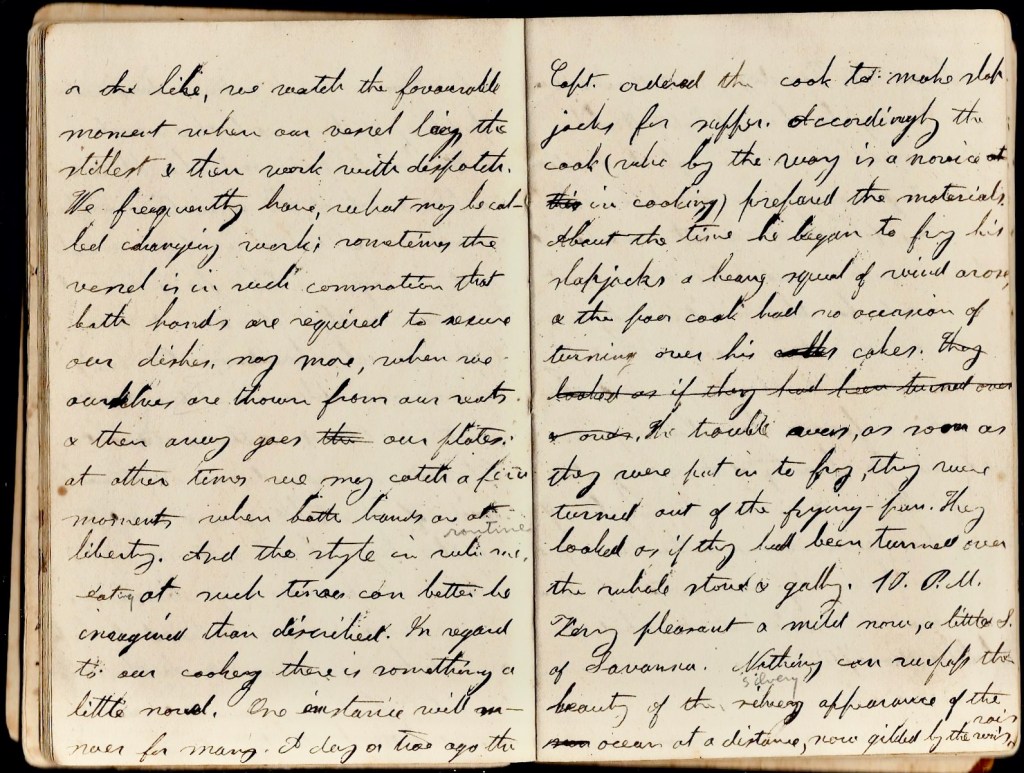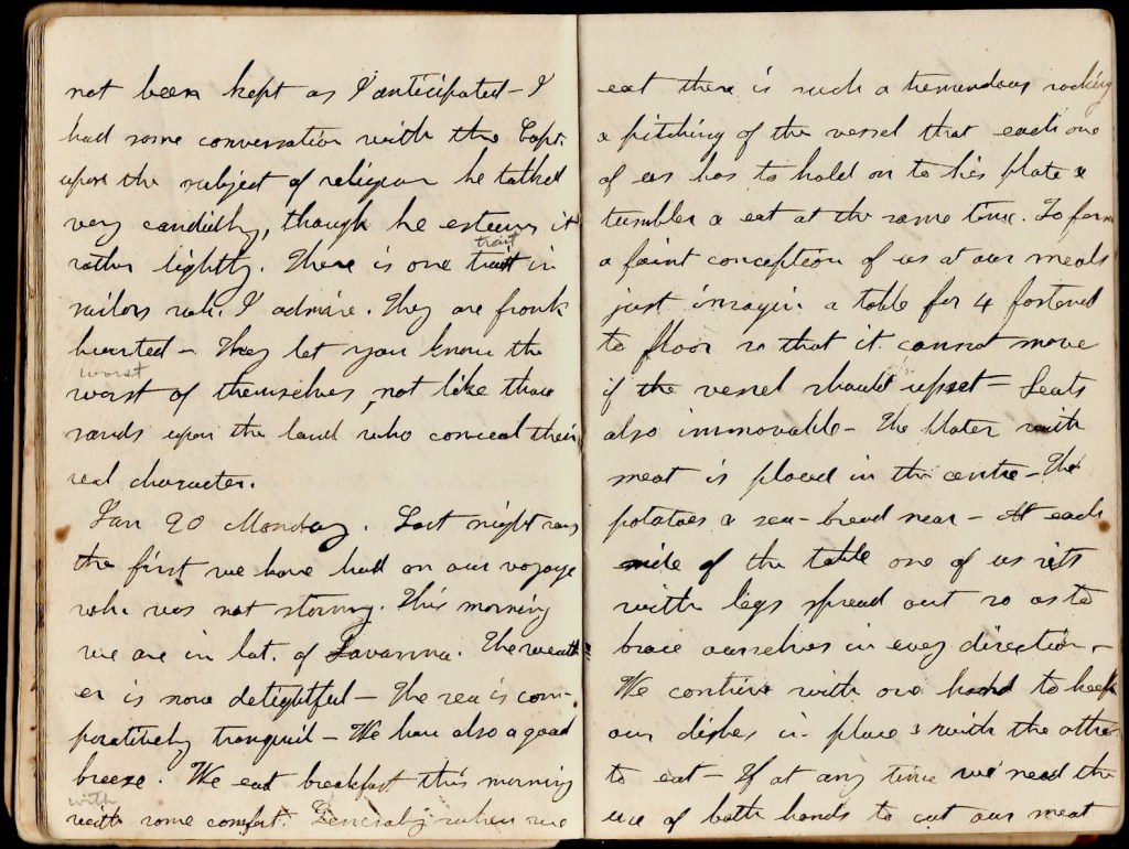 January 20th. Monday. Last night was the first we have had on our voyage which was not stormy. This morning we are in latitude of Savannah. The weather is now delightful. The sea is comparatively tranquil. We have also a good breeze. We eat breakfast this morning with some comfort. Generally when we eat there is such a tremendous ricking and pitching of the vessel that each one of us has to hold on to his plate & tumbler and eat at the same time. To form a faint conception of us at our meals, just imagine a table for four fastened to the floor so that it cannot move if the vessel should upset. Seats also immovable. The platter with meat is placed in the centre. The potatoes and sea-bread near. At each side of the table one of us sits with legs spread out so as to brace ourselves in every direction. We continue with one hand to keep our dishes in place and with the other to eat. If at any time we need the use of both hands to cut our meat or the like, we watch the favorable moment when our vessel lies the stillest and then work with dispatch. we frequently have what may be called changing work. Sometimes the vessel is in such commotion that both hands are required to secure our dishes, nay more, when we ourselves are thrown from our seats & then away goes our plates. At other times we may catch a few moments when both hands are at liberty. And the style is routine eating at such times can better be imagined than described. In regard to our cooking, there is something a little novel. One instance will answer for many. A day ot two ago the captain ordered the cook to make flapjacks for supper. Accordingly the cook (who by the way is a novice at cooking) prepared the materials. About the time he began to fry his flapjacks a heavy squall of wind arose and the poor cook had no occasion of turning over his cakes. The trouble over, as soon as they were put in to fry, they were turned out of the frying pan. They looked as if they had been turned over the whole stove and galley. 10 p.m. Very pleasant and mild now. A little south of Savannah. Nothing can surpass the beauty of the silvery appearance of the ocean at a distance, now gilded by the waves.
