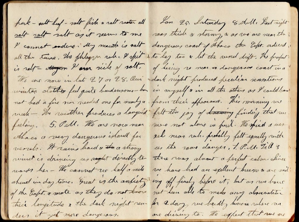 We are now in latitude 27 or 28. Our winter clothes feel quite burdensome. Have not had a fire nor needed one for nearly a week. The weather produces a languid feeling. 5 p.m. We are now near Abaco—a very dangerous island for vessels. It rains hard and a strong wind is driving us directly towards her. we cannot see half a mile ahead in day time. Great is the anxiety of the captain and mate and the dark night renders it yet more dangerous.