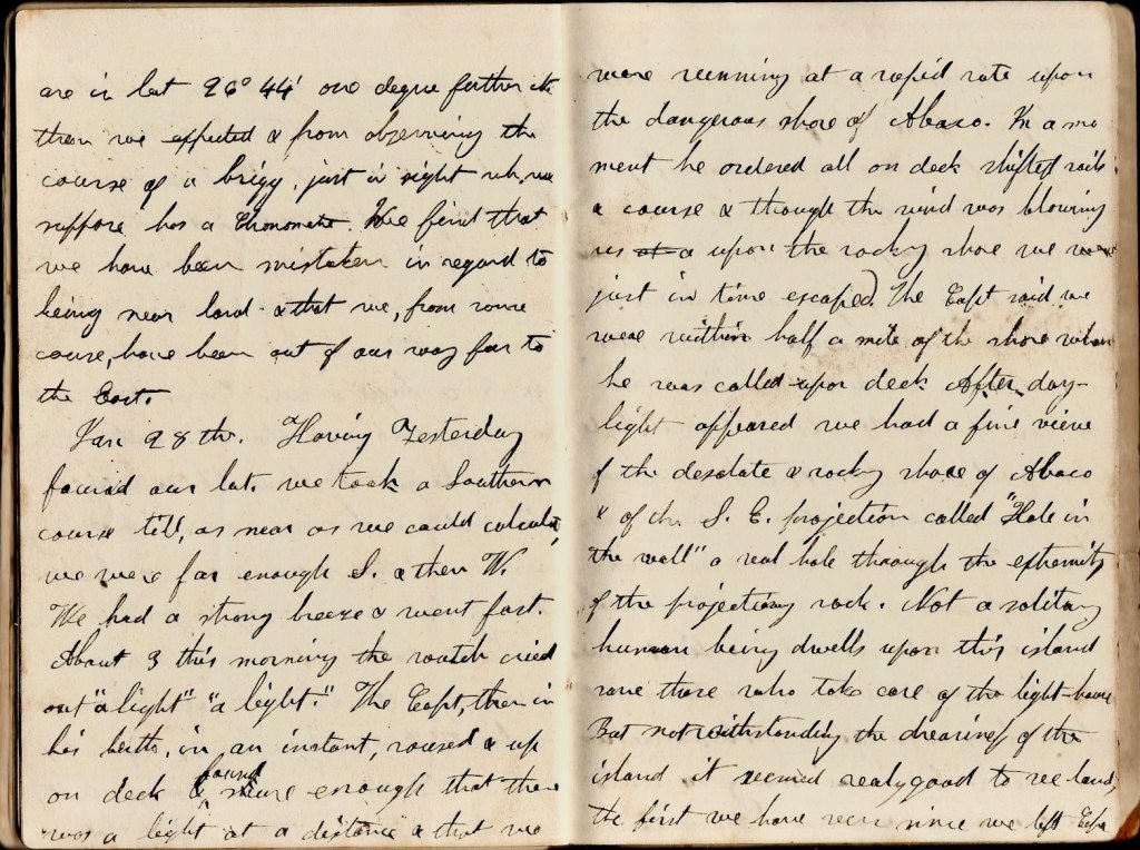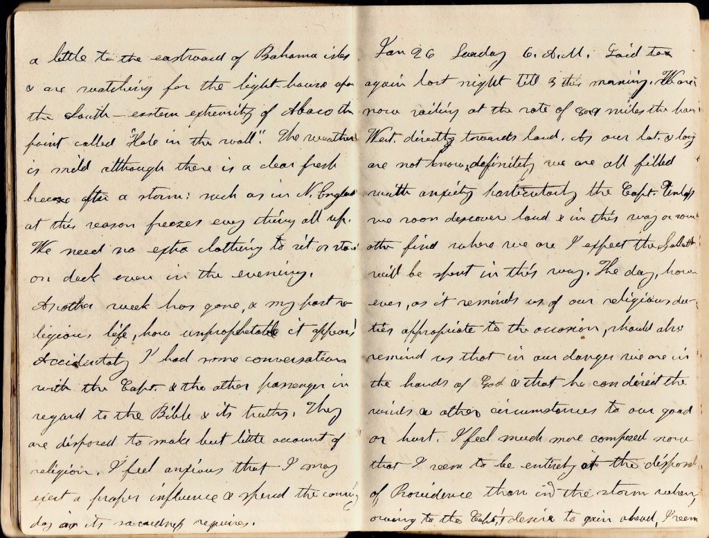 January 25th. Saturday. 8 a.m. Last night was thick and stormy and as we are near the dangerous coast of Abaco, the captain ordered to lay to & let the wind drift. The prospect of being so near a dangerous coast in a dark night produced peculiar sensations in myself and in all the others as I could tell from their appearance. This morning we felt the joy of finding that we were not along in peril. We spied a vessel near which probably felt equally with us the same danger. 1 p.m. till 3 there was almost a perfect calm. Since we had an excellent breeze & are sailing off finely before it, but as we have not been able to make any observations for two days, we hardly know where we are driving to. we expect that we are a little to the eastward of Bahama isles & are watching for the lighthouse upon the southeastern extremity of Abaco—the point called “Hole in the Wall.” The weather is mild although there is a clear, fresh breeze after a storm such as in New England at this season freezes everything all up. We need no extra clothing to sit or stand on deck even in the evening. Another week has gone and my past religion, life, how unprofitable it appears! Accidentally, I had some conversations with the captain and the other passenger in regard to the Bible & its truths. They are disposed to make but little account of religion. I feel anxious that I may exert a proper influence & spend the coming day as its sacredness requires.