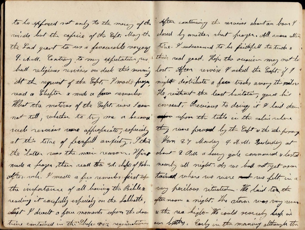 January 26th. Sunday 6 a.m. Laid to again last night till 3 this morning. We are now sailing at the rate of 8 or 9 miles to the hour west, directly towards land. As our latitude and longitude are not known definitely, we are all filled with anxiety, particularly the captain. Unless we soon discover land and in this way or some other find where we are, I expect the Sabbath will be spent in this way. The day, however, as it reminds us of our religious duties appropriate to the occasion, should also remind us that in our danger we are in the hands of God & that He can direct the winds and other circumstances to our good or hurt. I feel much more composed now that I seem to be entirely at the disposal of Providence than in the storm when owing to the captain’s desire to gain ahead, I seem to be exposed not only to the mercy of the winds but the caprice of the captain. May the Lord grant to us a favorable voyage. 9 a.m. Contrary to my expectation, we had religious services on deck this morning. At the request of the captain, I made prayer, read a chapter & made a few remarks. What the motives of the captain were I cannot tell—whether to try me or because such services were appropriate especially at this time of fearful anxiety. I think the latter was the main reason. I first made a prayer, then read the 3rd chapter of John, after which I made a few remarks first upon the importance of all having the Bible and reading it carefully—especially on the Sabbath. Next I dwelt a few moments upon the doctrine contained in the chapter—viz: regeneration. After continuing the services about an hour, I closed by another short prayer. All were attentive. I endeavored to be faithful to truth & their real good. Hope the occasion may not be lost. After service I asked the captain if I might distribute a few tracts among the sailors. He without the least hesitation gave his consent. Previous to doing it. I laid them upon the table in the cabin where they were perused by the captain and the other psasenger.