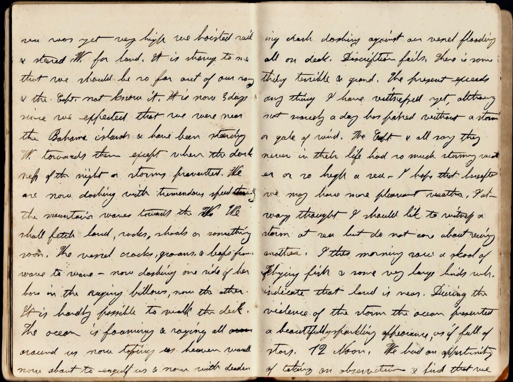 January 27th. Monday, 9 a.m. Yesterday at about 2 p.m. a heavy gale commenced and lasted nearly all night. As we had not yet ascertained where we were, we felt in a very perilous situation. We laid to the afternoon and night. The storm was very severe and the sea high. We could scarcely keep in our berths. Early in the morning although the sea was yet very high, we hoisted sail & steered west for land. It is strange to me that we should be so far out of our way and the captain not know it. It is now three days since we expected that we were near the Bahama islands and have been steering west towards them except when the darkness of the night or storms prevents. We are now dashing with tremendous speed through the mountainous waves towards the west. We shall fetch land, rocks, shoals, or something soon. The vessel cracks, groans, and leaps from wave to wave—now dashing one side of her bow in the raging billows, now the other. It is hardly possible to walk the deck. The ocean is foaming and spraying all around us now, tossing us heaven ward now, about to engulf us now, with deadening crash, dashing against our vessel, flooding all on deck. Description fails. There is something terrible and grand. The present exceeds anything I have witnessed yet, although not nearly a day has passed without a storm or a gale of wind. The captain & all say they never in their life had so much stormy weather or so high a sea. I hope that hereafter we may have more pleasant weather. I always thought I should like to witness a storm at sea, but do not care about seeing another. I this morning saw a school of flying fish and some very large birds which indicate that land is near. During the violence of the storm the ocean presented a beautifully sparking appearance, as if full of stars. 12 noon. We had an opportunity of taking an observation & find that we are in latitude 26 o 44′ one degree further north than we expected & from observing the course of a brig just in sight which we suppose has a chronometer, we find that we have been mistaken in regard being near land & that we from some course, have been out of our way far to the east.