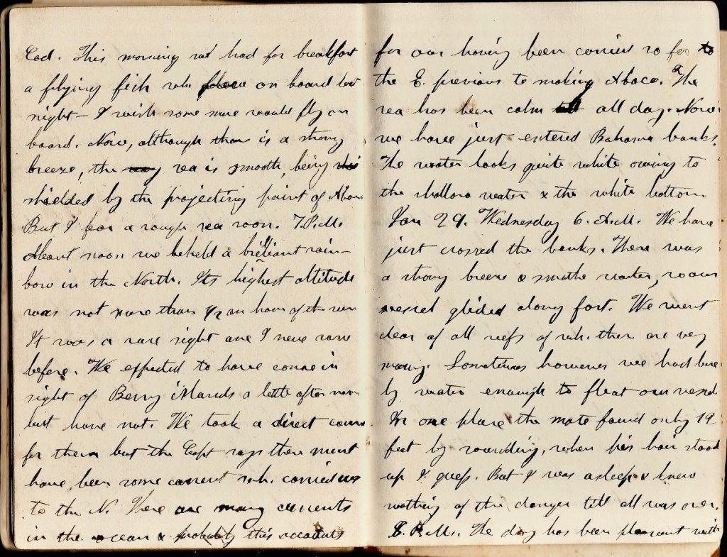 January 28th. Having yesterday found our latitude, we took a southern course till, as near as we could calculate, we were far enough south & then west. We had a strong breeze & went fast. About 3 this morning the watch cried out, “A light! A light!” The captain then in his berth, in an instant, roused & up on deck found sure enough that there was a light at a distance & that we were running at a rapid rate upon the dangerous shore of Abaco. In a moment he ordered all on deck, shifted sails, and course & though the wind was blowing us upon the rocky shore, we just in time escaped. The captain said we were within half a mile of the shore when he was called upon deck. After daylight appeared we had a fine view of the desolate & rocky shore of Abaco & of the southeast projection called “Hole in the Wall”—a real hole through the extremity of the projecting rock. Not a solitary human being dwells upon this island save those who take care of the lighthouse. But notwithstanding the dreariness of the island, it seemed really good to see land—the first we have seen since we left Cape Cod. This morning we had for breakfast a flying fish which flew on board last night. I wish some more would fly on board. Now, although there is a strong breeze, the sea is smooth, being shielded by the projecting point of Abaco. But I fear a rough sea soon. 7 p.m. About noon we beheld a brilliant rainbow in the North. Its highest altitude was not more than half an hour of the sun. It was a rare sight and I never saw before. We expected to have come in sight of Berry Islands a little after noon but have not. We took a direct course for them but the captain says there must have been some current which carried us to the north. There are many currents in the ocean & probably this accounts for our having been carried so far to the east previous to maing Abaco. The seas has been calm all day. Now we have just entered Bahama banks. The water looks quite white owing to the shallow water & the white bottom.
