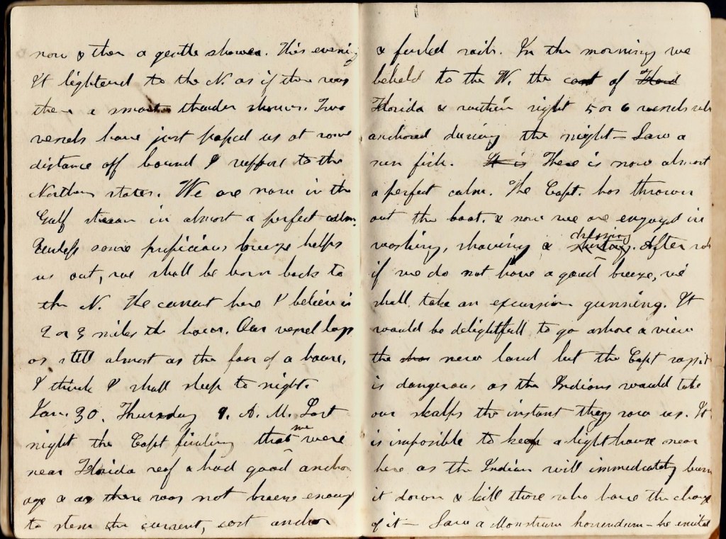 January 29th. Wednesday 6 a.m. We have just crossed the banks. There was a strong breeze & smooth water so our vessel glided along fast. We went clear of all reefs of which there are very many. Sometimes, however, we had barely enough water to float our vessel. In one place the mate found only 12 feet by sounding when his hair stood up I guess. But I was asleep and knew nothing of the danger till all was over. 8 p.m. The day has been pleasant with now and then a gentle shower. This evening it lightened to the N. as if there was there a thunder shower. Two vessels have just passed us at some distance off bound I suppose to the Northern States. We are now in the Gulf stream in almost a perfect [ ]. Unless some precipitous breeze helps us out, we shall be borne back to the North. The current here, I believe, is 2 or 3 miles to the hour. Our vessel lays still. I think I shall sleep tonight.