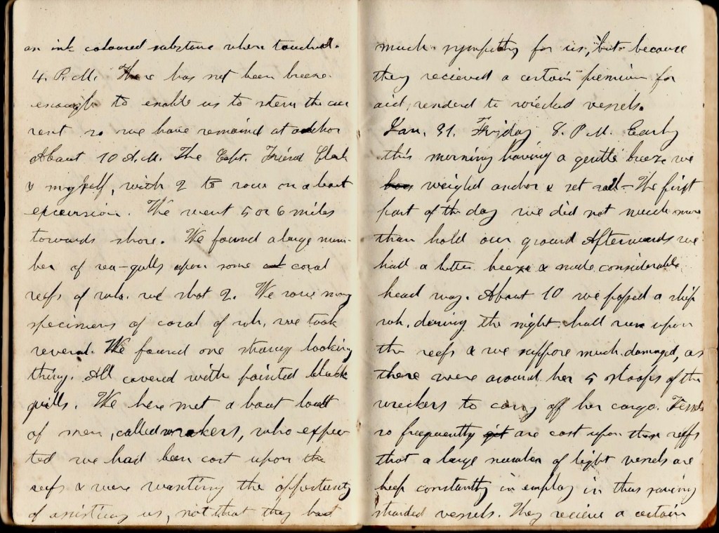 January 30th. Thursday, 9 a.m. Last night the captain finding that we were near Florida reef and had good anchorage & as there was not breeze enough to stem the current, cast anchor & furled sails. In the morning we beheld to the west the coast of Florida & within sight 5 or 6 vessels which anchored during the night. Saw a [ ] fish. There is now almost a perfect calm. The captain has thrown out the boat & now we are engaged in working, shoving, & [ ] after which if we do not have a good breeze, we shall take an excursion gunning. It would be delightful to go ashore and view the new land but the captain says it is dangerous as the Indians would take our scalps the instant they saw us. It is impossible to keep a lighthouse near here as the Indians will immediately burn it down & kill those who have the charge of it. Saw a monstrous horrendium [squid]. He emitted an ink colored substance when touched. 4 p.m. There has not been breeze enough to enable us to stern the current so we have remained at anchor. About 10 a.m., the captain, friend Clark, and myself with two to row on a boat excursion. We went 5 or 6 miles toward shore. We found a large number of seagulls upon some coral reefs of which we shot two. We saw many specimens of coral of which we took several. We found one starry looking thing all covered with painted black quills. We here met a boat load of men called wreckers who expected we had been cast upon the reefs & were wanting the opportunity of assisting us, not that they had much sympathy for us, but because they received a certain premium for aid rendered to wrecked vessels.