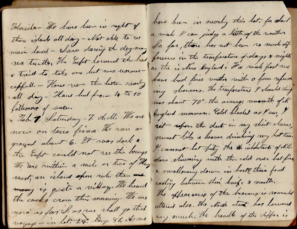 February 1st. Saturday 7 a.m. We are now on terra firma. We ran aground about 6. It was dark and the captain could not see the bouys. We are within a mile or two of Key West, an island upon which there is quite a village. We heard the clocks crow this morning. We are now as far south as we shall go this voyage, in latitude 24o longitude 81. As we have been in nearly this latitude for about a week, I can judge a little of the weather. So far, there has not been so much difference in the temperatures of days and nights as there is in New England. For a week past, we have had fine weather with a few refreshing showers. The temperatures I should think was about 70o the average warm of New England summers. Cold-blooded as I am, I sit upon the deck in my shirt sleeves, sweat like a beaver drinking my hot tea. I cannot but pity the inhabitants of New England now shivering with the cold over hot fires & swallowing down in haste their food, cooling between their knife and mouth. The appearance of the heavens is somewhat altered also. The North star has lowered very much. The handle of the dipper is almost in the ocean when between the star. I can see several new bright stars to the south. They were often much higher than in New England. 8 p.m. We took pilot and got off about 9. The day has been very warm and pleasant. Have but scarcely no breeze. The surface of the water as far as the eye could reach all around was smooth as glass. Saw hundreds of black ducks in flocks. Saw several porpoises & large fish. We are now moving very slowly towards colder weather & trying the waters of the Gulf of Mexico.