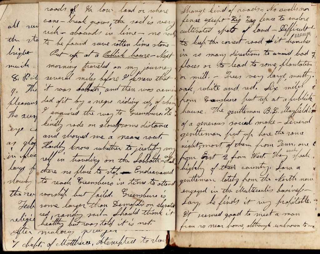 Next morning traveled on my journey several miles before I knew that it was Sabbath and then was reminded of it by a negro riding up of whom I enquired the way to Greensboro. He kindly rode on slowly some distance and showed me a near route. Hardly know whether to justify myself in traveling on the Sabbath but there was no place to stop. Endeavored to reach Greensboro in time to attend worship but failed. Greensboro is some larger that Demopolis on elevated red, sandy soil. Should thnk it healthy but was told it is not. Strange kind of roads. No walls nor fence except zig-zag fence to enclose cultivated spots of land. Difficulty to keep correct road, it branches in so many directions to arrive bad places or to lead to come plantation or mill. Trees very large, mostly oak—white and red. Six miles from Greensboro, put up at a publick house. The gentleman, B. L. Mayfield, is of a generous social make. Several gentlemen put up here the same night, most of them from Tennessee, one from the East, 2 from the West. They each speak highly of their country. Saw a gentleman lately from the North now engaged in the multicanlis [silk] business. Says he finds it very profitable. It seemed good to meet a man from so near home although unknown to me. He appears (I fear that is all) to be a real friend to me in my present circumstances. I humbly pray the Lord to direct me in the path of duty and to give me wisdom to see clear of every danger. The gentleman with whom I stopped would take nothing for my lodging &c. The gentleman from the North—Mr. Davis—offered to carry me to Tuscaloosa if I would wait till the next day.