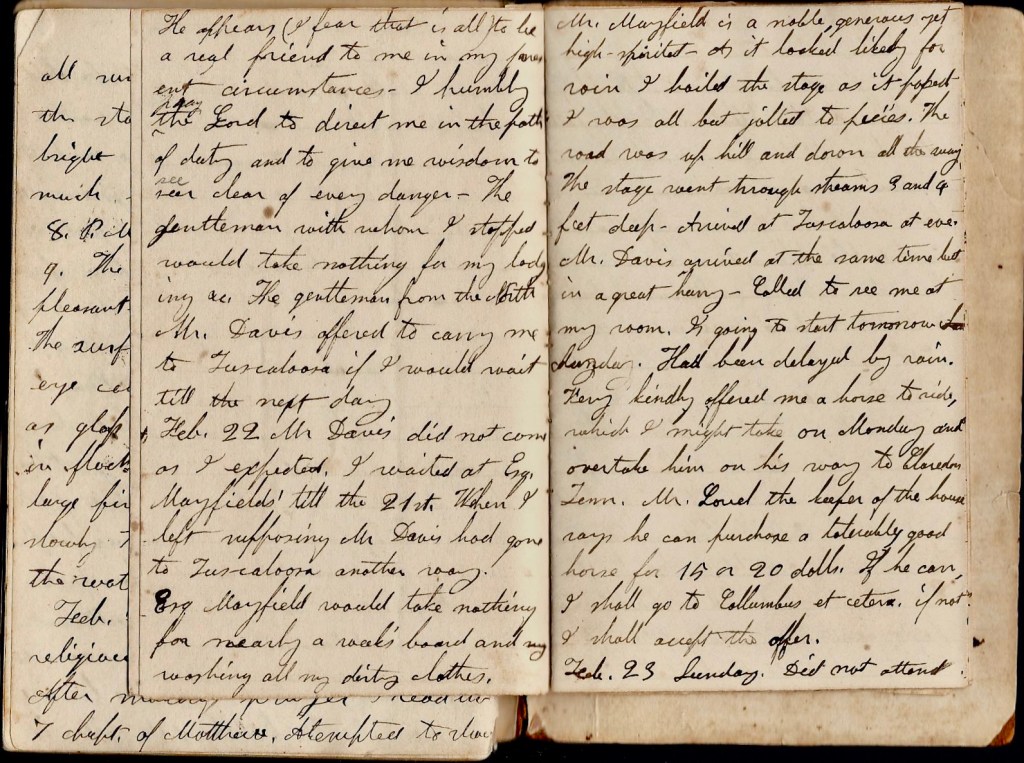 February 22nd. Mr. Davis did not come as I expected. I waited at Esq. Mayfield’s till the 21st when I left supposing Mr. Davis had gone to Tuscaloosa another way. Esq. Mayfield would take nothing for nearly a week’s board and washing all my dirty clothes. Mr. Mayfield is a noble, generous, yet high-spirited [man]. As it looked likely for rain, I hailed the stage as it passed. I was all but jolted to pieces. The road was up hill and down all the way. The stage went through streams 3 and 4 feet deep. Arrived at Tuscaloosa at eve. Mr. Davis arrived at the same time but in a great hurry. Called to see me at my room. Is going to start tomorrow—Sunday. Had been delayed by rain. Very kindly offered me a horse to ride which I might take on Monday and overtake him on his way to Clarendon, Tennessee. Mr. Lovell, the keeper of the [publick] house says he can purchase a tolerably good horse for 15 or 20 dollars. If he can, I shall go to Columbus et cetera. If not, I shall accept the offer [of Mr. Davis].