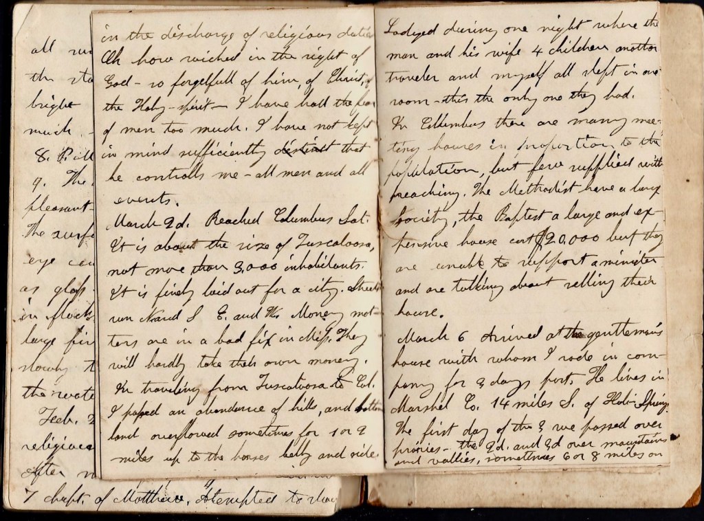 March 2nd. Reached Columbus [Mississippi] Saturday. It is about the size of Tuscaloosa, not more than 3,000 inhabitants. It is finely laid out for a city—streets run north and south, east and west. Money matters are in a bad fix in Mississippi. They will hardly take their own money. In traveling from Tuscaloosa to Columbus, I passed an abundance of hills and bottom land, overflowed sometimes for 1 or 2 miles up to the horses’ belly and side. Lodged during one night where the man and his wife, 4 children, another traveler and myself, all slept in one room. This is the only one they had.