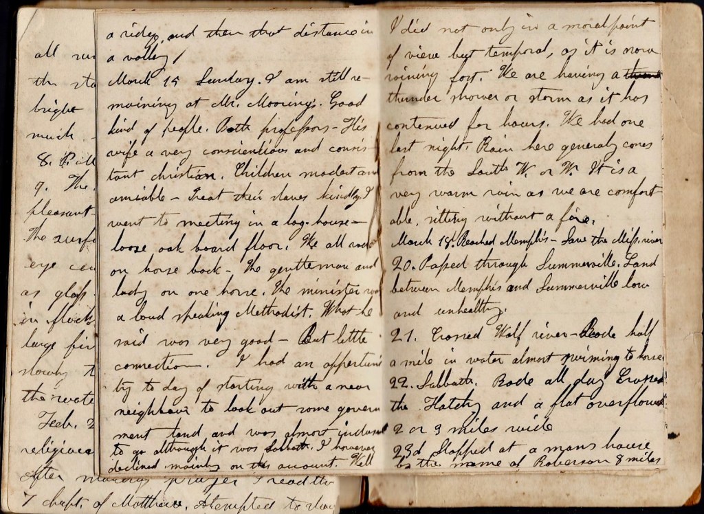 March 15th. Sunday. I am still remaining at Mr. Mooring’s. Good kind of people. Both professors. His wife a very good, conscientious, and consistent Christian. Children modest and amiable. Treat their slaves kindly. I went to meeting in a log house—loose oak board floor. We all rode on horseback. The gentleman and lady on one horse. The minister was a loud-speaking Methodist. What he said was very good but little connection. I had an opportunity today of starting with a near neighbor to look out some government land and was almost induced to go although it was Sabbath. I however declined mainly on this account. Well I did not only in a moral point of view, but temporal, as it is now raining fast. We are having a thunder shower or storm as it has continued for hours. We had one last night. Rain here generally comes from the southwest or west. It is a very warm rain as we are comfortable sitting around a fire.