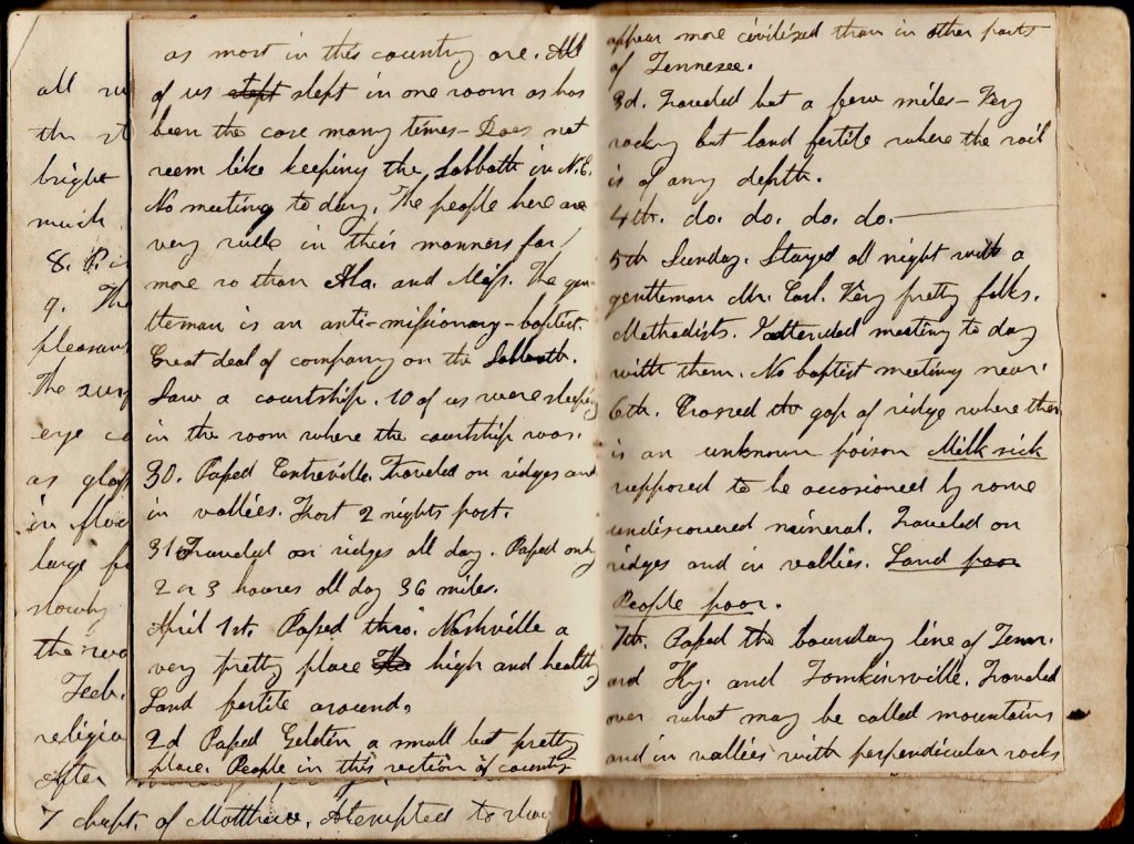 March 29th. Sunday, Now stopping for the day about 20 miles west of Centreville [Tennessee] with a Baptist—a very plain man as most are. All of us slept in one room as has been the case many times. Does not seem like keeping the Sabbath in New England. No meeting today. The people here are very rude in their manners, far more so than Alabama and Mississippi. The gentleman is an Anti-missionary Baptist. Great deal of company on the Sabbath. saw a courtship. 10 of us were sleeping in the room where the courtship was.