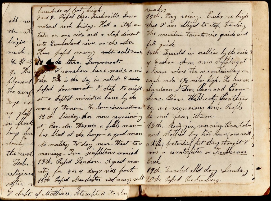 April 7th. Passed the boundary line of Tennessee and Kentucky and Tomkinsville. Traveled over what may be called mountains and in valleys with perpendicular rocks hundreds of feet high.