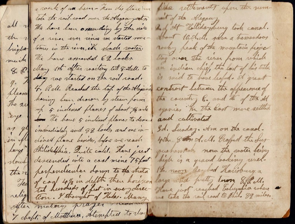 May 1st. After waiting till 8 a.m. today we started on the railroad. 4 p.m. Reached the top of the Alleghenies having been drawn by steam power up 5 inclined planes of about half mile. We have 5inclined planes to descend immediately and 82 locks and one inclined plane besides before we reach Philadelphia. Quite cold. Have just descended into a coal mine 75 feet perpendicular down to the strata of coal 4.5 in depth, then horizontal hundreds of feet in every direction. I thought of Hades. Many settlements upon the summit of the Alleghenies.