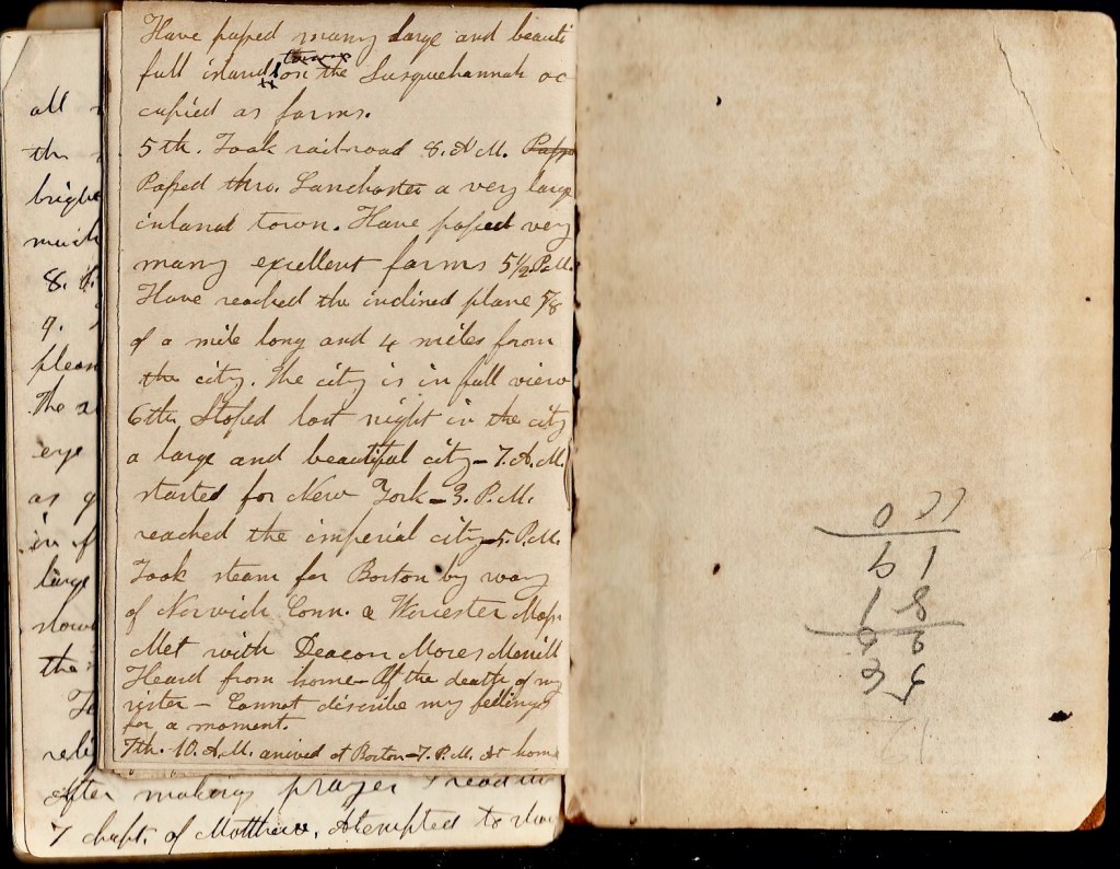 May 6th. Stopped last night in the city—a large and beautiful city. 7 a.m started for New York. 3 p.m. Reached the Imperial City. 5 p.m. Took steam for Boston by way of Norwich, Connecticut & Worcester, Massachusetts. Met with Deacon Moses Merrill. Heard from home of the death of my sister [Lydia F. Clark (1821-1840)]. Cannot describe my feelings for a moment.