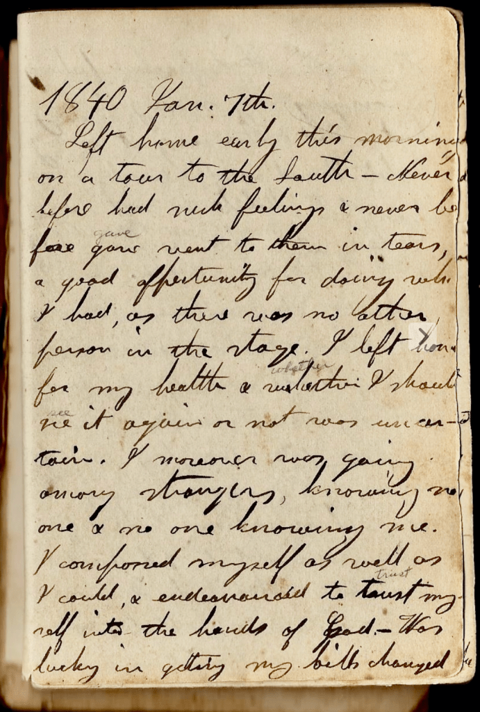 January 7th—Left home early this morning on a tour to the South. Never before had such feelings and never before gave vent to them in tears, a good opportunity for doing which I had as there was no other person in the stage. I left home for my health & whether I should see it again nor not was uncertain. I moreover was going among strangers, knowing no one & no one knowing me. I composed myself as well as I could & endeavored to trust my self into the hands of God. Was lucky in getting my bills changed into specie. Had peculiar feeling in carrying my money in my shirt. Had rather carry it in my pocket. Found an opportunity of sailing out to Mobile the next day.