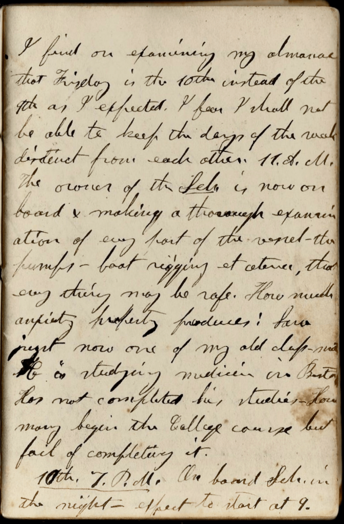 I find on examining my almanac that Friday is the 10th instead of the 9th as I expected. I fear I shall not be able to keep the days of the week distinct from each other. 11 a.m., the owner of the schooner is now on board & making a thorough examination of every part of the vessel—the pumps, the boat rigging, et cetera—that everything may be safe. How much anxiety property produces! Saw just now one of my old classmates. He is studying medicine in Boston. Has not completed his studies. How many begin the college course but fail completing it.