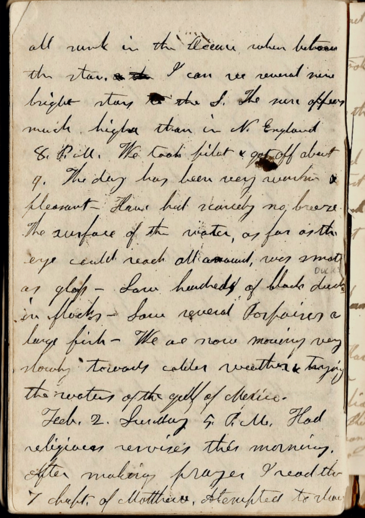 February 4th. Tuesday 5 p.m. There was not much rain but a stormy wind which has continued with a little abatement today present from the N, to N. E. The weather has been clear & cool. It appears like the clear N. W. wind in New England after a storm. There has been quite a change in the weather & sea. For a week previous to the last date, we had warm weather & a smooth sea—sometimes so smooth that as far as the eye could reach scarcely a riffle or a swell could be seen. But after the commencement of the wind in less than an hour the sea was all in commotion & our vessel upon the rock & toss. I have been sea sick all the time since & been obliged to keep my berth for the most part. I begin to think that I was not made for a sea animal. Terra firma suits me best. The weather has been quite cool though not freezing. We feel it more because lately had such warm weather. We have for a week past seen one or two vessels nearly every day, some far off, some near. Today we saw two, one of which came very near as it passed. Our captain spoke her. She was bound to Havana. The two captains were acquainted. When they recognized each other, they called each other by name & not being able to great each other with a hearty shake of the hands, they did it by swinging their hat and jumping which they seemed to be in perfect ecstasy. We have now about 300 miles to go in a N. W. course. I hope we shall soon be over with this ricking and pitching. I cannot exercise or take comfort in anything.