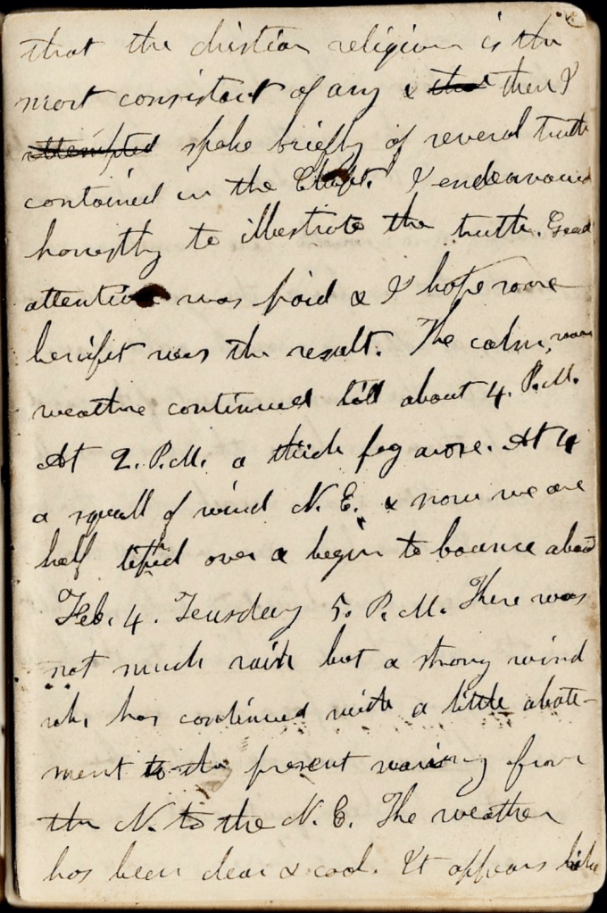 February 2. Sunday, 5 p.m. Had religious services this morning. After making prayers, I read the 7th Chapter of Mathew. Attempted to show that the Christian religion is the most consistent of any & then I spoke briefly of several truths contained in the chapter. I endeavored honestly to illustrate the truth. Great attention was paid & I hope some benefit was the result. The calm, warm weather continued till about 4 p.m. At 2 p.m. a thick fog arose. At 4 a squall of wind N. E. & now we are half lifted over & begin to bounce ahead.