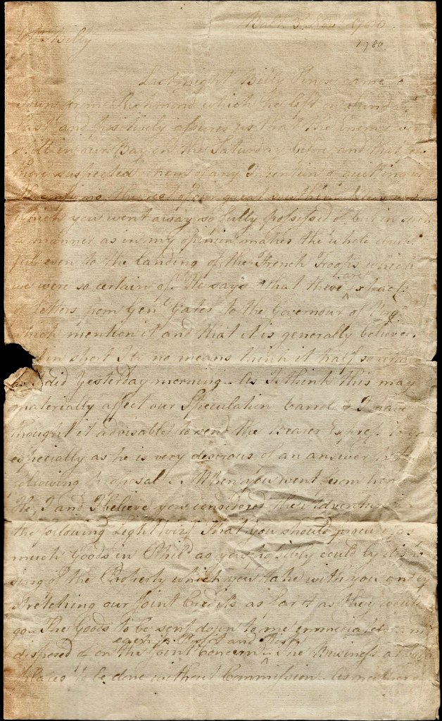 Last night Billy Knox came to town from Richmond which he left on Sunday last and positively assures us that the Enemy were still in our [Chesapeake] Bay on the Saturday before and that [ ] there suspected them of any intention of quitting it. He confirms the rest of our great southern news 1 in which you went away so fully possessed of but in such a anner as in my opinion makes the whole doubtful even to the landing of the French troops which we were so certain of. 2 He says that there are stacks of letters from Gen. Gates to the Governor of Virginia which mention it and that it is generally believed and in short I by no means think it half so [ ] as I did yesterday morning. As I think this may materially affect our speculation, Carrol & I have thought it advisable to send the bearer Express to you–especially as he is very desirous of an answer to the following proposal.