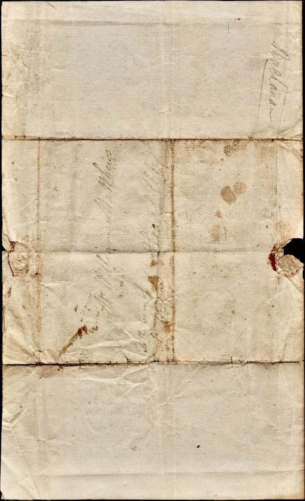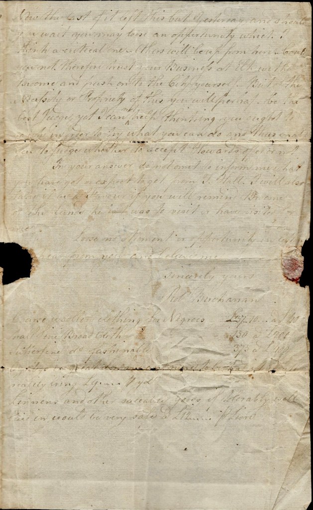 This letter was written in early November 1780 by Baltimore textile merchant Robert Buchanan. It was addressed to his business partner William Matthews in care of Mr. Broome of Elk, Maryland. The gist of this letter is a proposal designed to capitalize on the war-time restriction of the maritime trade caused by the British fleet patrolling the Chesapeake Bay. Though money was tight, Buchanan proposes to stretch the firm’s credit limits as far as they would go in order to buy up goods in other markets speculating that he could sell them at profit in Baltimore and vicinity.
