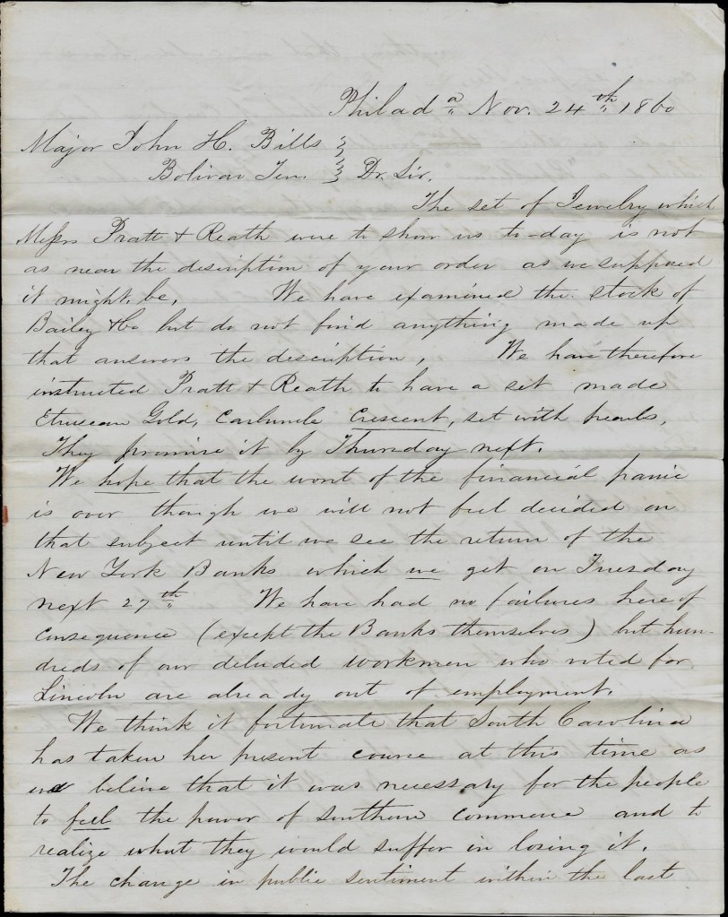 The set of jewelry which Messers. Pratt & Reath were to show us today is not as near the description of your order as we supposed it might be. We have examined the stock of Bailey & Co. but do not find anything made up that answers the description. We have therefore instructed Pratt & Reath to have a set made Etruscan Gold, Carbuncle Crescent, set with pearls. They promise it by Thursday night. We hope that the worst of the financial panic is over though we will not feel decided on that subject until we see the return of the New York Banks which we get on Tuesday next 27th. We have had no failures here of consequence (except the Banks themselves) but hundreds of our deluded workmen who voted for Lincoln are already out of employment.
