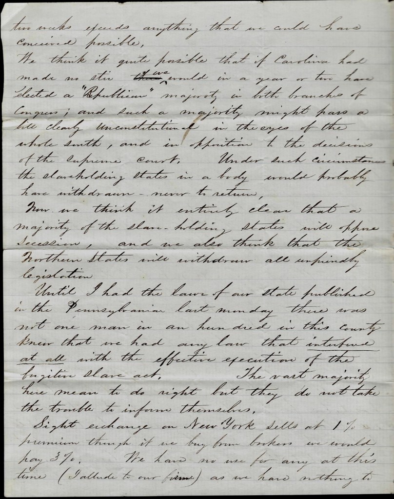 We think it quite possible that if Carolina had made no stir, we would in a year or two have elected a “Republican” majority in both branches of Congress; and such a majority might pass a bill clearly unconstitutional in the eyes of the whole South, and in opposition to the decisions of the Supreme Court. Under such circumstances, the slaveholding states in a body would probably have withdrawn—never to return. Now we think it entirely clear that a majority of the slave-holding states will oppose secession, and we also think that the Northern States will withdraw all unfriendly legislation.