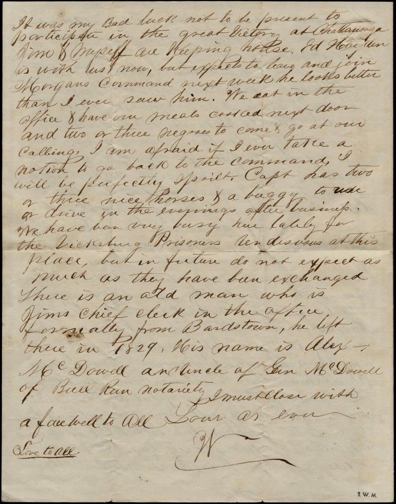 We have given the Yankees an awful whipping at Chattanooga. Our Kentucky Brigade lost very severe. I have not heard the loss yet. John Wisotzki 2 just just left here yesterday. He is clerking in the Adjutant General’s Office of Gen. Joe Johnston’s. He promised to send this letter through for me. Farewell. Yours, — W