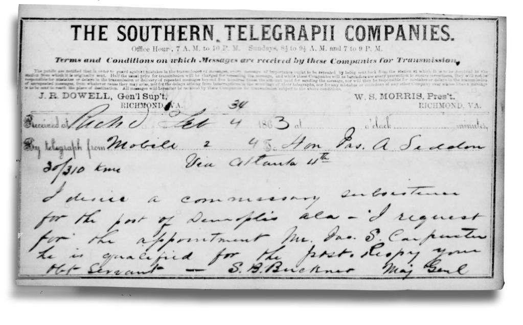 “I desire a commissary subsistence for the post of Demopolis, Ala. I request for the appointment Mr. Jas. S. Carpenter. He is qualified for the post. Respectfully your obedient servant, — S. B. Buckner, Maj. Gen’l”