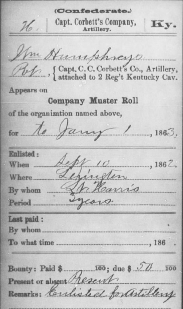 Willie enlisted in September 1862 in Capt. C. C. Corbett’s Company of Light Artillery that was attached to the 2nd Regiment of Kentucky Cavalry. This battery may have broken up before the summer of 1863 but it’s likely the remnants continued to ride with Morgan’s Kentucky Cavalry Squadron on its raid through Indiana and Ohio in July 1863. In the letter, “Willie” described his hairbreadth escape from capture by hiding out on the river bank for two days, swimming across the Ohio at night with the aide of a fence rail, and then outrunning Union pursuers in West Virginia as he walked 200 miles to get back to Confederate lines.