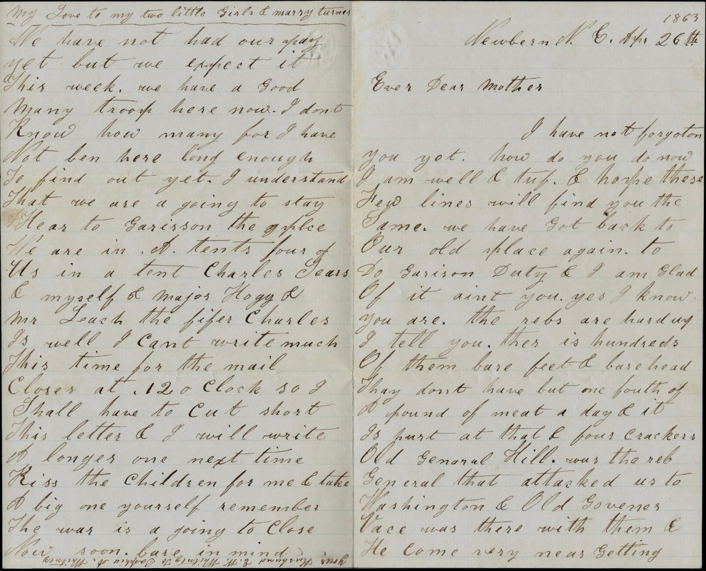 We hear that the rebs are a getting whipped & I am glad of it, ain’t you? I think you are. I think the war will be closed before long. We have not had our pay yet but we expect it this week. We have a good many troops here now. I don’ know how many for I have not been here long enough to find out yet. I understand that we are a going to stay here to garrison the place. We are in A tents—four of us in a tent. Charles Sears and myself and Major Hogg & Mr. [Addison] Leach, the fifer. Charles is well.