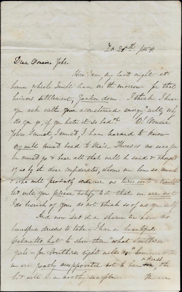 Here I am, my last night at home, which I will leave on the morrow for that heinous settlement, Yankeedom. I think I hear you ask with your accustomed energy, “Well, why do you go if you hate it so bad?” Oh! Cousin John dearest, I must. I have learned to now my will must bend to Ma’s. There is no escape, we must go and bear all that will be said & thought of us by the dear confederates whom we love so much and who will probably consider us turncoats & traitors but will you please testify to it that we are not. I do beseech of you, do not think so of us yourself.