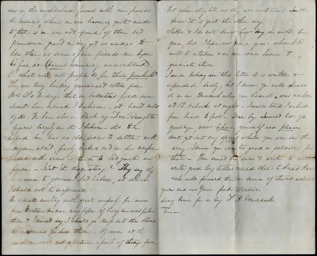I see on looking over this letter it is written & expressed badly; but I know you will excuse it in a Murdock when you hear it was written at 12 o’clock at night. I was so tired I ached from head to foot. Dear boy, I must bid you goodbye. Now behave yourself and please don’t get any sprees while you are in the army. I know you are too good a soldier for that. You must be sure & write to me. Write good long letters & send them to Hard Have & she will forward them in some of theirs. Adieu to you and yours, fond cousin. — F. H. Murdock