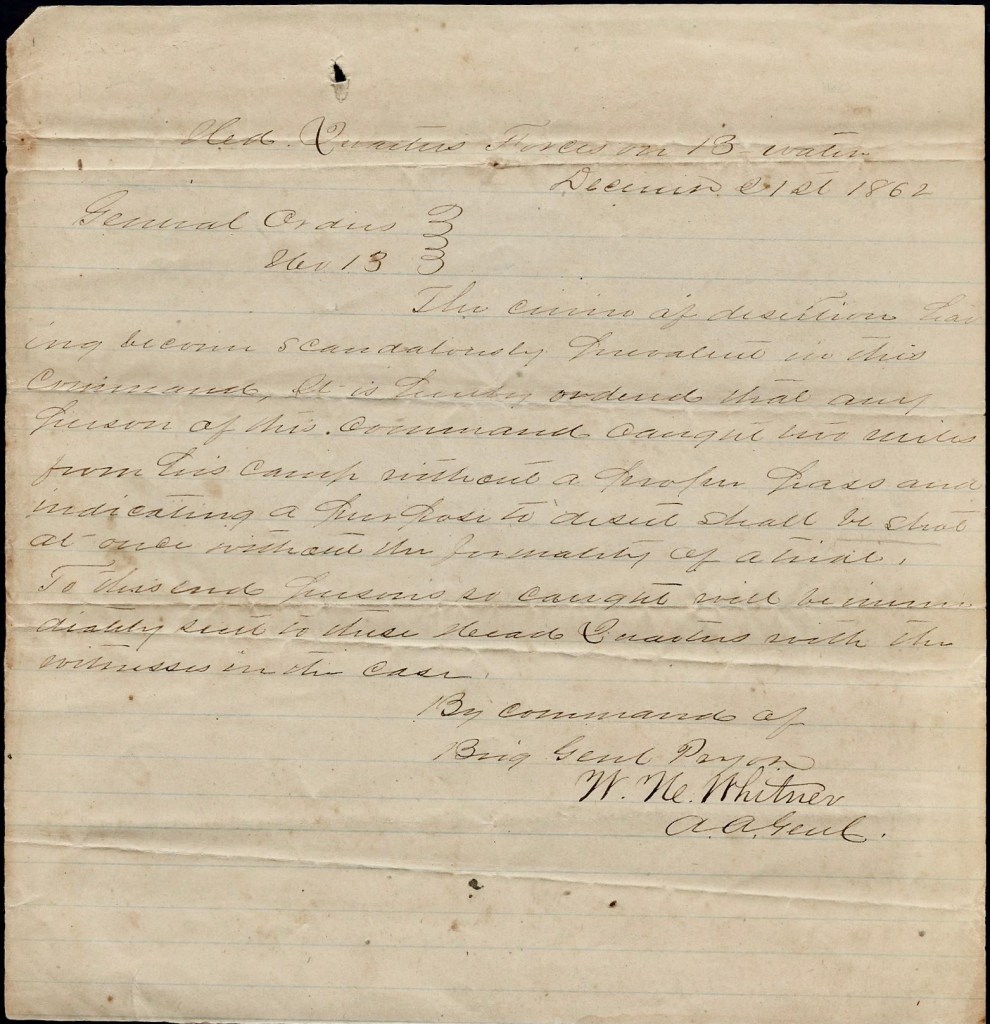 The crime of desertion having become scandalously prevalent in this command, it is hereby ordered that any person of this command caught two miles from this camp without a proper pass and indicating a purpose to desert shall be shot at once without the formality of a trial. To this end, persons so caught will be immediately sent to these headquarters with the witnesses in the case.