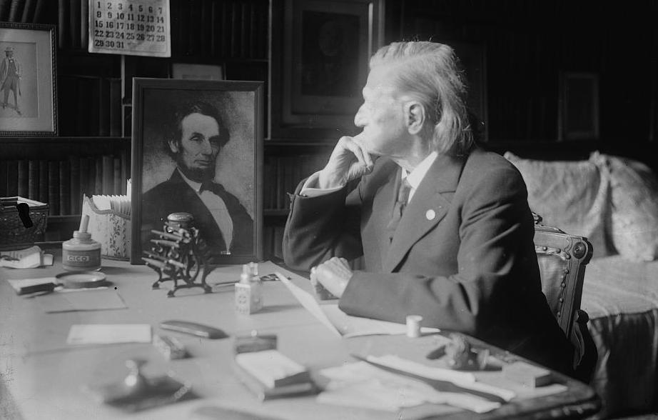 Pryor in later years looking at a portrait of the man who paroled him, Abraham Lincoln.