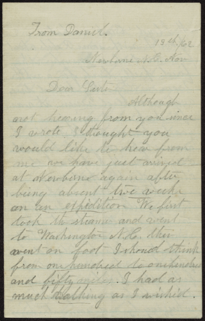 Although not hearing from you since I wrote, I thought you would like to hear from me. We have just arrived at Newbern again after being absent two weeks on an expedition. We first took the steamer and went to Washington, N C. Then went on foot I should think from one hundred to one hundred and fifty miles. I had a much walking as I wished.