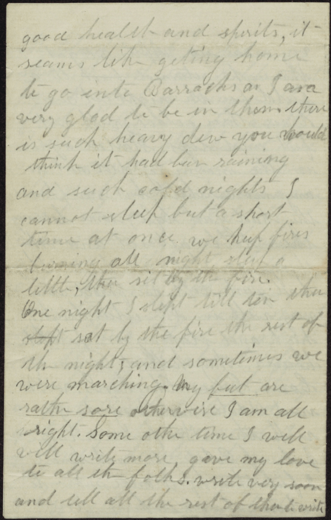 There is such heavy dew you would think it had been raining and such cold nights. I cannot sleep but a short time at once. We keep fires burning all night, sleep a little, then sit by the fire. One night I slept till ten, then sat by the fire the rest of the night. and sometimes we were marching. My feet are rather sore. Otherwise I am all right. Some other time I will write more. Give my love to all the folks. Write very soon and tell all the rest of them to write.