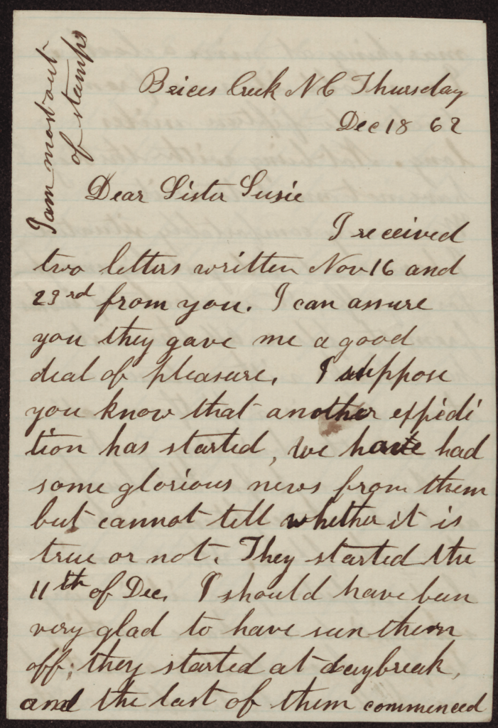 I received two letters written November 16 and 23rd from you. I can assure you they gave me a good deal of pleasure. I suppose you know that another expedition has stated. We have had some glorious news from them but cannot tell whether it is true or not. They started the 11th of December [on the Goldsboro Expedition]. I should have been very glad to have seen them off, but they started at daybreak and the last of them commenced marching at nine o’clock. I was told it was from twelve to fifteen miles long. Not being with the regiment, I have not much to write.