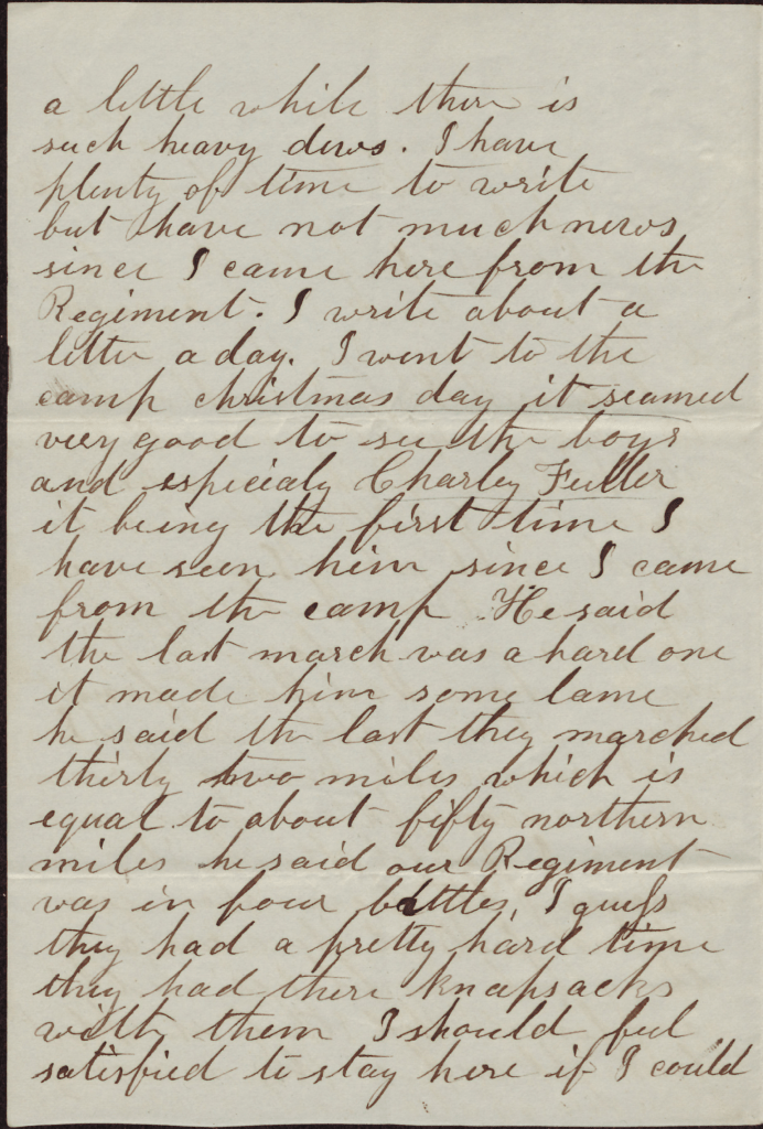 I went to the camp Christmas day. It seemed very good to see the boys and especially Charley Fuller, it being the first time I have seen him since I came from the camp. He said the last march was a hard one. It made him some lame. He said the last they marched thirty-two miles which is equal to about fifty northern miles. He said our regiment was in four battles. I guess they had a pretty hard time. They had their knapsacks with them. I should feel satisfied to stay here if I could feel that I was doing anything for my country for which I came here. If I have to stay here [at Brice’s Creek], I shall be so lazy when I get back that I cannot do anything.