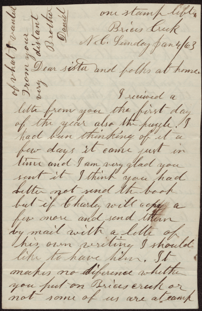 March 3, [1863]—There is a surgeon examining us. He is going to send us to camp or discharge us I believe he from Washington. I guess he will send me to camp. He has examined me and said he thought I could go back to camp. I cannot stop to write more now. In haste, your affectionate brother, — Daniel