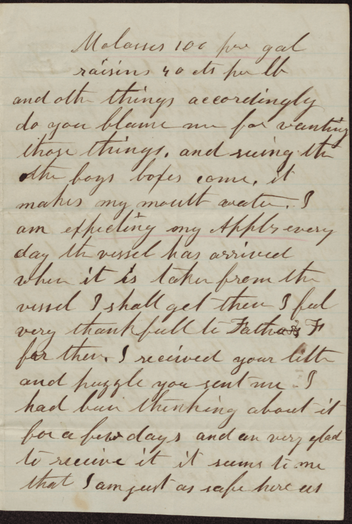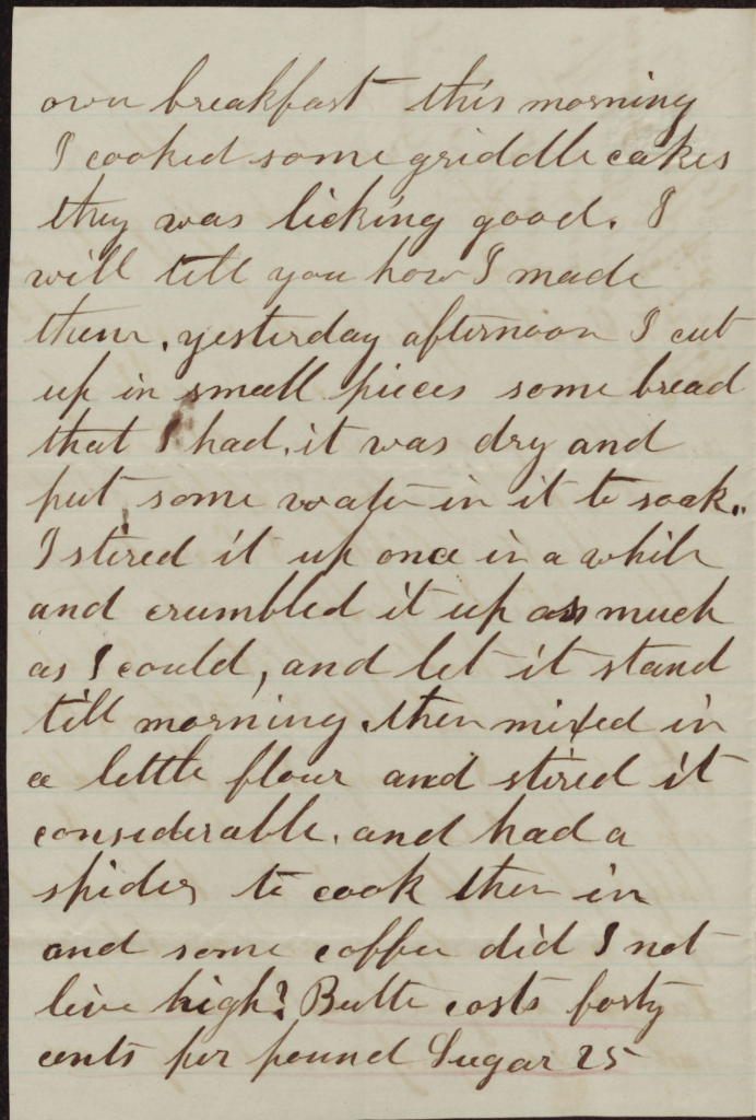 You would laugh if you could see us some mornings cooking our own breakfast. This morning I cooked some griddle cakes. They was licking good. I will tell you how I made them. Yesterday afternoon I cut up in small pieces some bread that I had. It was dry and put some water in it to soak. I stirred it up once in awhile and crumbled it up as much as I could and et it stand till morning. Then mixed in a little flour and stirred it considerable and had a spider to cook them in and some coffee. Did I not live high? Butter costs forty cents per pound, sugar 25, molasses $1 per gallon, raisins 40 cents per lb. and other things accordingly. Do you blame me for wanting those things and seeing the other boys’ boxes come? It makes my mouth water. I am expecting my apples every day. The vessel has arrived. When it is taken from the vessel, I shall get them. I feel very thankful to father for them.