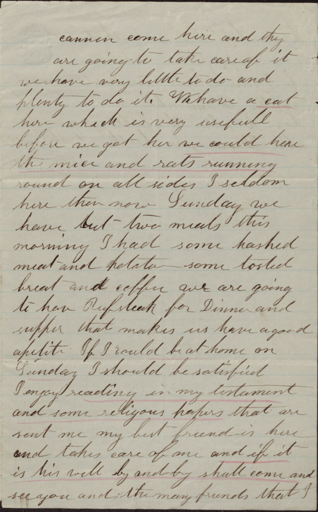 We have a cat here which is very useful. Before we got her, we could hear the mice and rats running round on all sides. I seldom hear them now. Sunday we have but two meals. This morning I had some hashed meat and potatoes, so toasted bread and coffee. We are going to have beef steak for dinner and supper. That makes us have a good appetite. If I could be at home on Sunday, I should be satisfied. I enjoy reading in my testament and some religious papers that are sent me. My best friend is here and takes care of me and if it is His will by and by, I shall come and see you and the many friends that I have left behind. That will be a happy time to me if I can return in health and safety.
