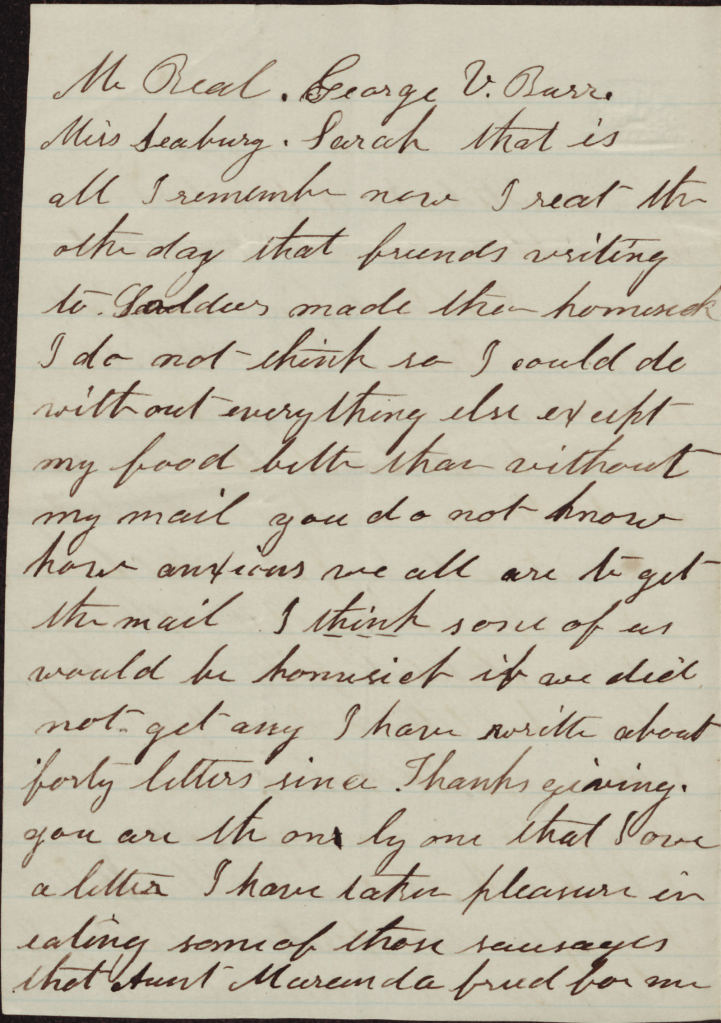 I have kept a journal since Thanksgiving…I have written about forty letters since Thanksgiving. You are the only one that I owe a letter. I have taken pleasure in eating some of those sausages that Aunt Maranda fried for me….