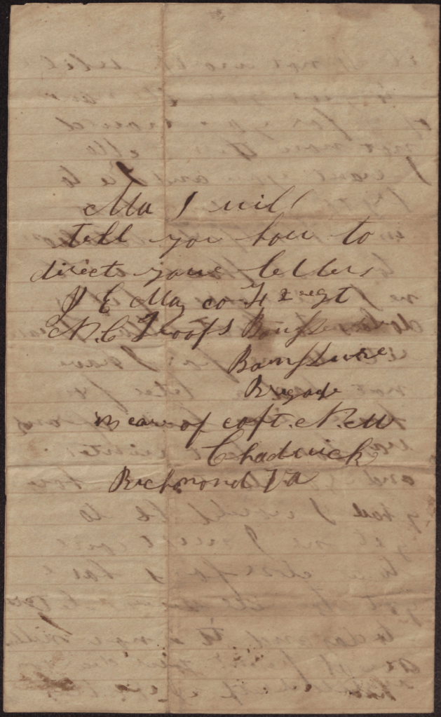 Ma, I will tell you how to direct your letters. J. E. May, Co. F, 2nd Regt., N. C. Troops, [Stephen D.] Ramseur’s Brigade, In care of Capt. N[athaniel] M[acon] Chadwick, Richmond, Va.