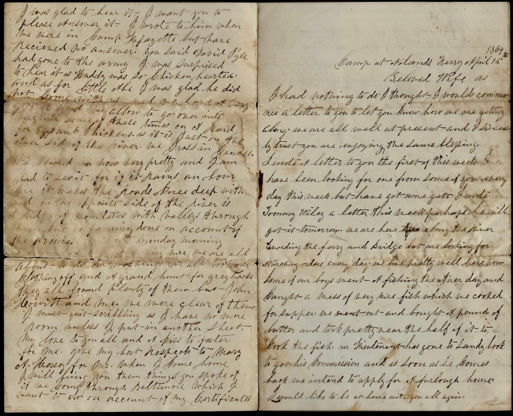 April 18th. Monday morning. The sun has come out very nice. We are all about to do our washing. We all took our clothing off and a grand hunt for greybacks [lice]. They all found plenty of them but John Howitt and me. We were clear of them. I must quit scribbling as I have no more room unless I put in another sheet. My love to you all and a kiss to Foster for me. Give my best respects to Mary A. Hersey for me. When I come home, I will bring you them tings you spoke of if we come through Baltimore, which I want to do on account of my certificate.