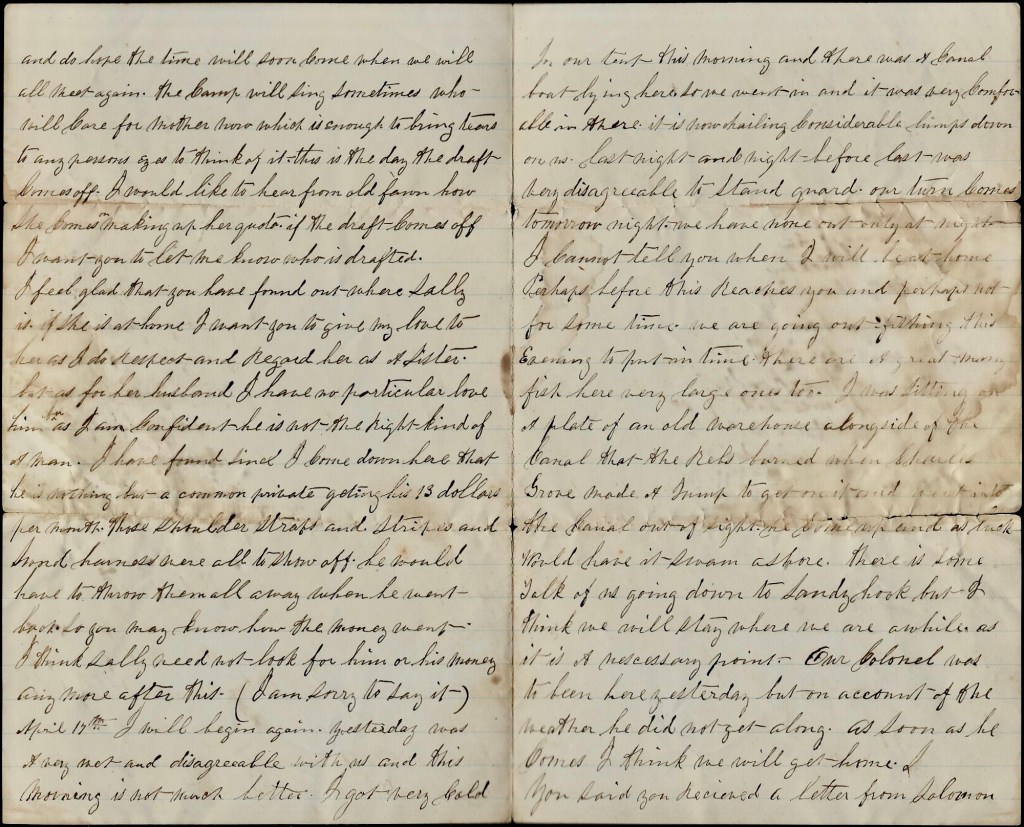 April 17th. I will begin again. Yesterday was wet and disagreeable with us and this morning is not much better. I got very cold in our tent this morning and there was a canal boat lying here so we went in and it was very comfortable in there. It is now hailing considerable—lumps down on us. Last night and night before last was very disagreeable to stand guard. Our turn comes tomorrow night. We have none out only at night. I cannot tell you when I will be at home. Perhaps before this reaches you and perhaps not for some time. We are going out fishing this evening to put in time. There are a great many fish here—very large ones too.