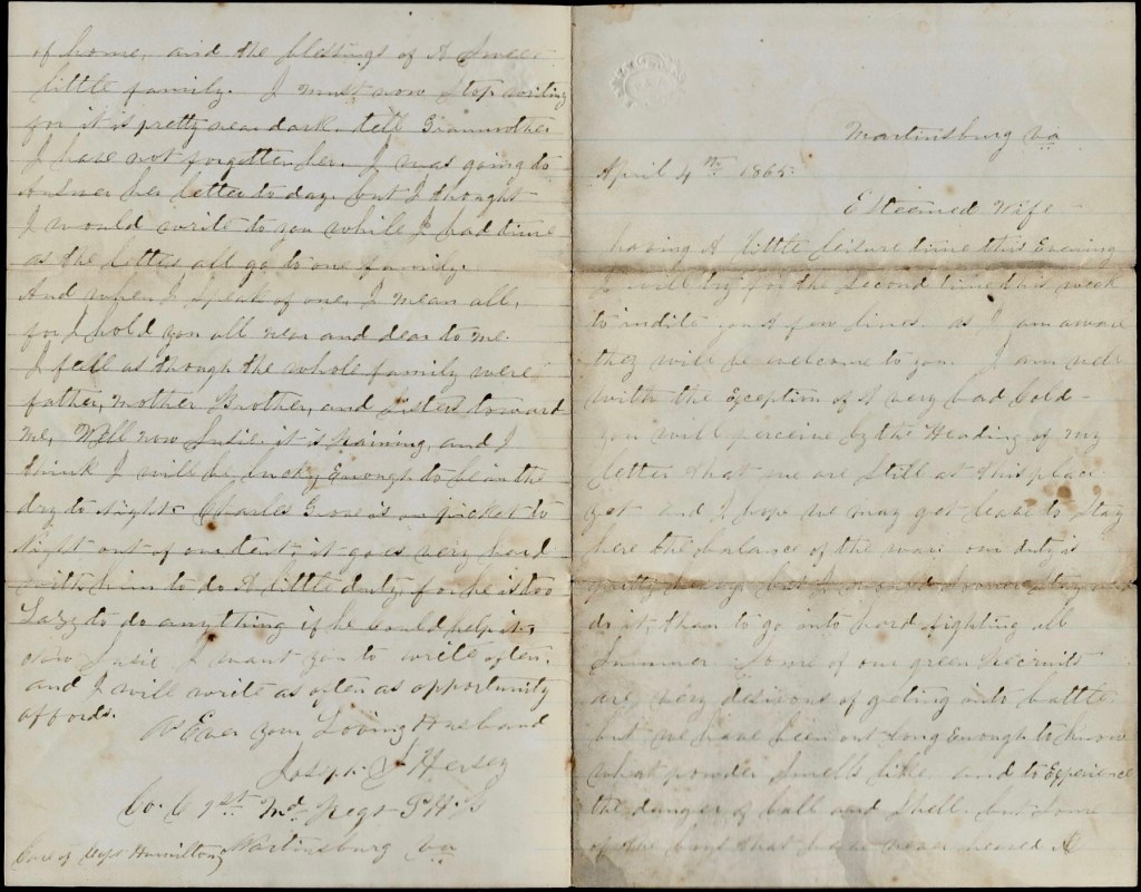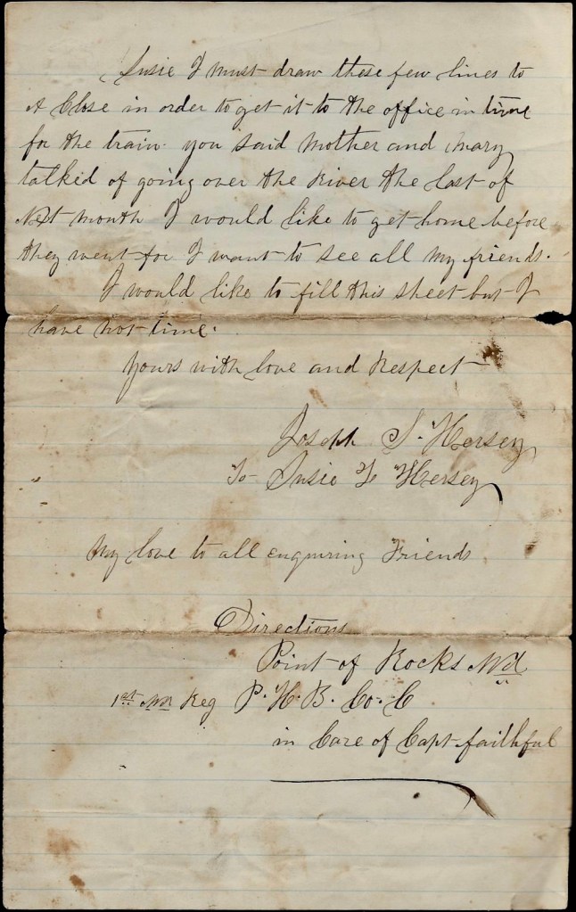 These two letters were written by Joseph Springer Hersey (1829-1911) who enlisted on 26 February 1864 to serve in Co. C, 1st Maryland Infantry Regiment, Potomac Home Brigade. This unit was transferred into Co. C, 13th Maryland Infantry after the cessation of hostilities.